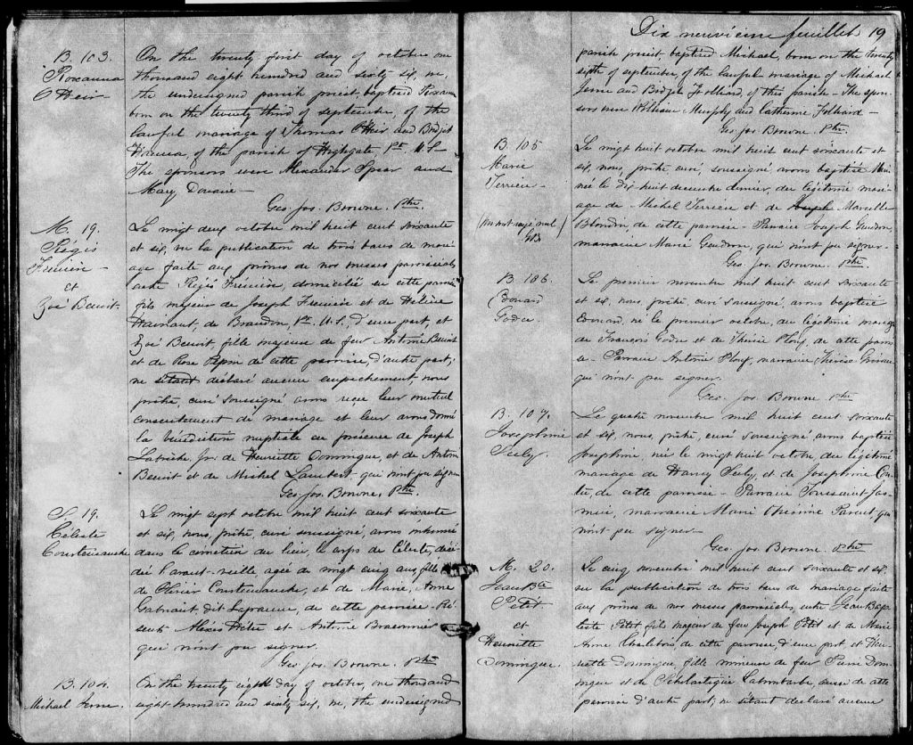 - Cette série regroupe les registres originaux de l'état civil, lesquels contiennent les enregistrements de baptêmes, de mariages et de sépultures consignés par le curé ou son représentant desservant la communauté de confession catholique de la paroisse de Sainte-Croix de Dunham pour la période 1850-1899. On retrouve également, en règle générale, un index nominatif situé à la fin de chaque registre
