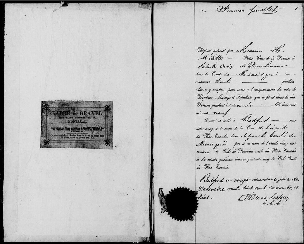 - Cette série regroupe les registres originaux de l'état civil, lesquels contiennent les enregistrements de baptêmes, de mariages et de sépultures consignés par le curé ou son représentant desservant la communauté de confession catholique de la paroisse de Sainte-Croix de Dunham pour la période 1850-1899. On retrouve également, en règle générale, un index nominatif situé à la fin de chaque registre