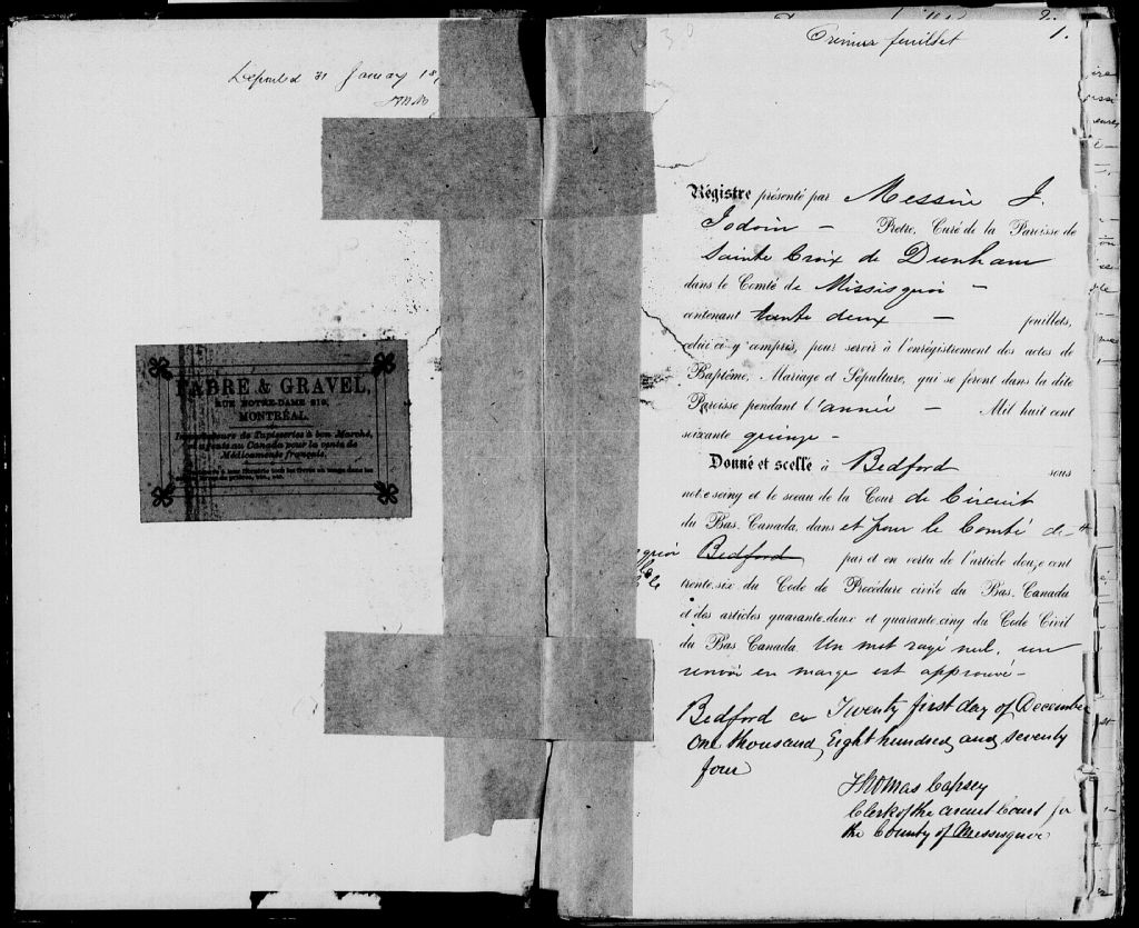 - Cette série regroupe les registres originaux de l'état civil, lesquels contiennent les enregistrements de baptêmes, de mariages et de sépultures consignés par le curé ou son représentant desservant la communauté de confession catholique de la paroisse de Sainte-Croix de Dunham pour la période 1850-1899. On retrouve également, en règle générale, un index nominatif situé à la fin de chaque registre