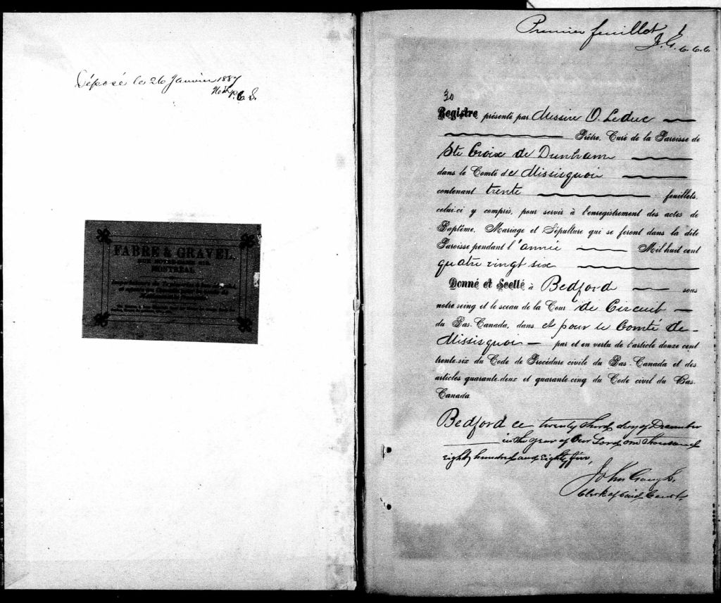 - Cette série regroupe les registres originaux de l'état civil, lesquels contiennent les enregistrements de baptêmes, de mariages et de sépultures consignés par le curé ou son représentant desservant la communauté de confession catholique de la paroisse de Sainte-Croix de Dunham pour la période 1850-1899. On retrouve également, en règle générale, un index nominatif situé à la fin de chaque registre