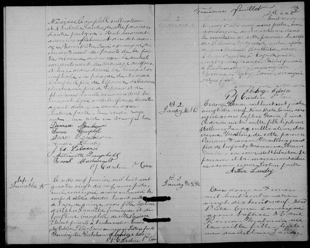 - Cette série regroupe les registres originaux de l'état civil, lesquels contiennent les enregistrements de baptêmes, de mariages et de sépultures consignés par le curé desservant la communauté de confession catholique de la paroisse de Saint-Pierre-de-Vérone de Pike River pour les années 1892-1899. On retrouve également, en règle générale, un index nominatif situé à la fin de chaque registre