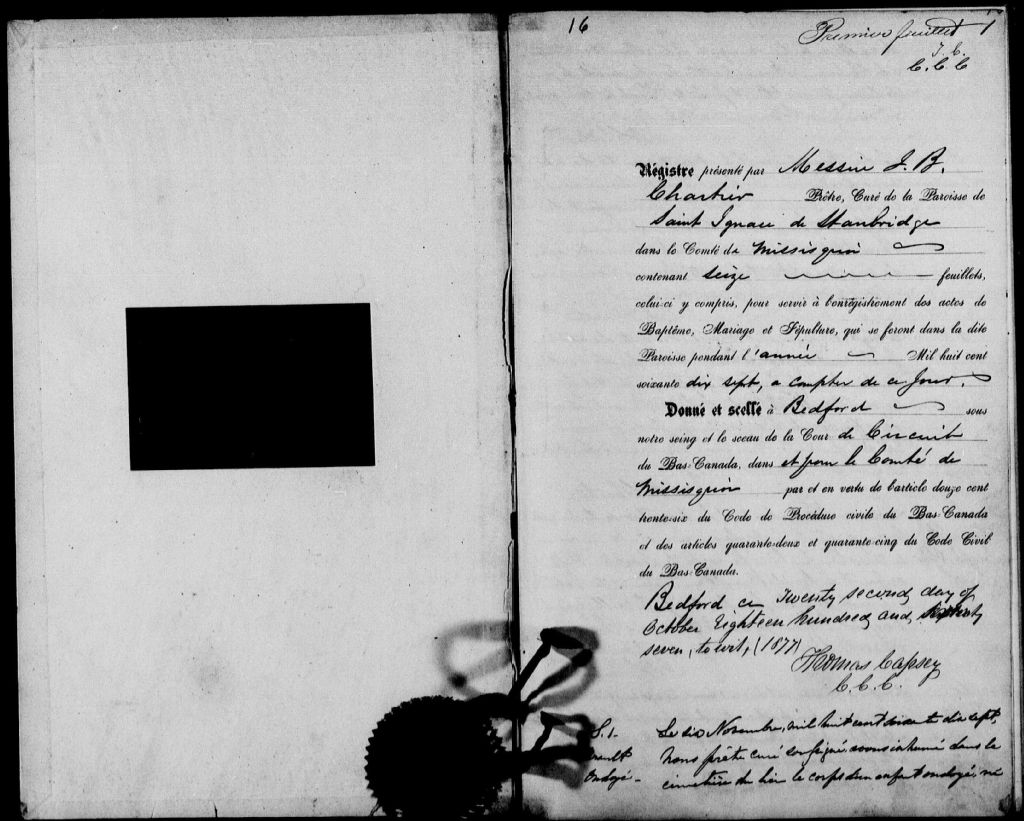 - Cette série regroupe les registres originaux de l'état civil, lesquels contiennent les enregistrements de baptêmes, de mariages et de sépultures consignés par le curé ou son représentant desservant la communauté de confession catholique de la paroisse de Saint-Ignace-de-Stanbridge pour la période 1877-1899. On retrouve également, en règle générale, un index nominatif situé à la fin de chaque registre