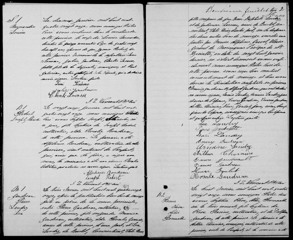 - Cette série regroupe les registres originaux de l'état civil, lesquels contiennent les enregistrements de baptêmes, de mariages et de sépultures consignés par le curé ou son représentant desservant la communauté de confession catholique de la paroisse de Saint-Ignace-de-Stanbridge pour la période 1877-1899. On retrouve également, en règle générale, un index nominatif situé à la fin de chaque registre