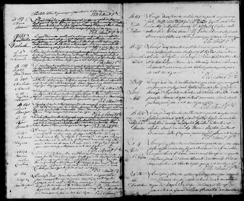 - Cette série regroupe les registres originaux de l'état civil, lesquels contiennent les enregistrements de baptêmes, de mariages et de sépultures consignés par le curé ou son représentant desservant la communauté de confession catholique de la paroisse de Notre-Dame-de-Bonsecours pour la période 1846-1899. On retrouve également, en règle générale, un index nominatif situé à la fin de chaque registre