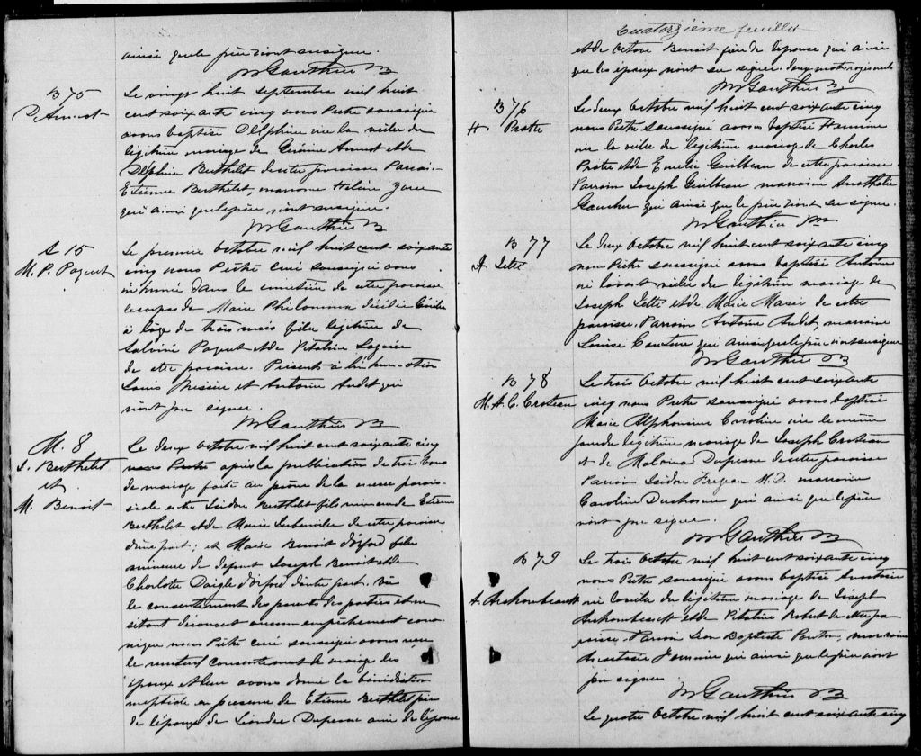 - Cette série regroupe les registres originaux de l'état civil, lesquels contiennent les enregistrements de baptêmes, de mariages et de sépultures consignés par le curé ou son représentant desservant la communauté de confession catholique de la paroisse de Notre-Dame-de-Bonsecours pour la période 1846-1899. On retrouve également, en règle générale, un index nominatif situé à la fin de chaque registre