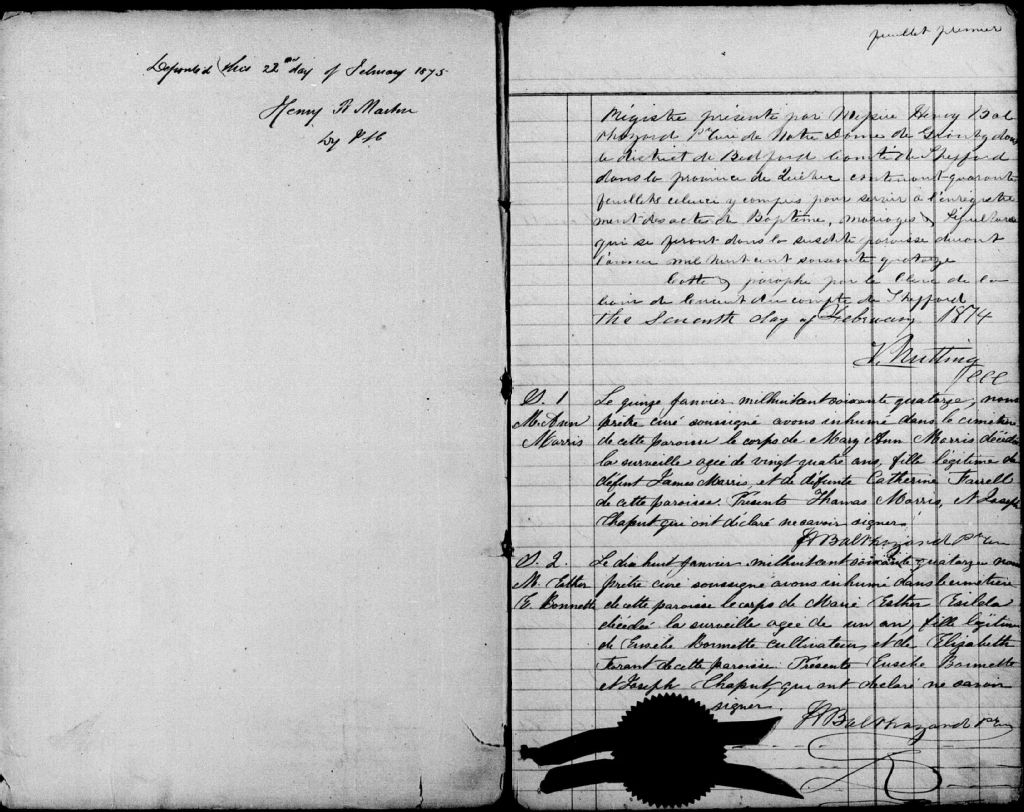 - Cette série regroupe les registres originaux de l'état civil, lesquels contiennent les enregistrements de baptêmes, de mariages et de sépultures consignés par le curé ou son représentant desservant la communauté de confession catholique de la paroisse de Notre-Dame-de-Granby pour la période 1851-1899. On retrouve également, en règle générale, un index nominatif situé à la fin de chaque registre