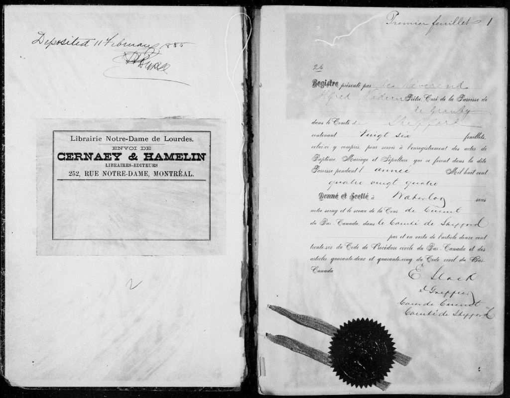 - Cette série regroupe les registres originaux de l'état civil, lesquels contiennent les enregistrements de baptêmes, de mariages et de sépultures consignés par le curé ou son représentant desservant la communauté de confession catholique de la paroisse de Notre-Dame-de-Granby pour la période 1851-1899. On retrouve également, en règle générale, un index nominatif situé à la fin de chaque registre