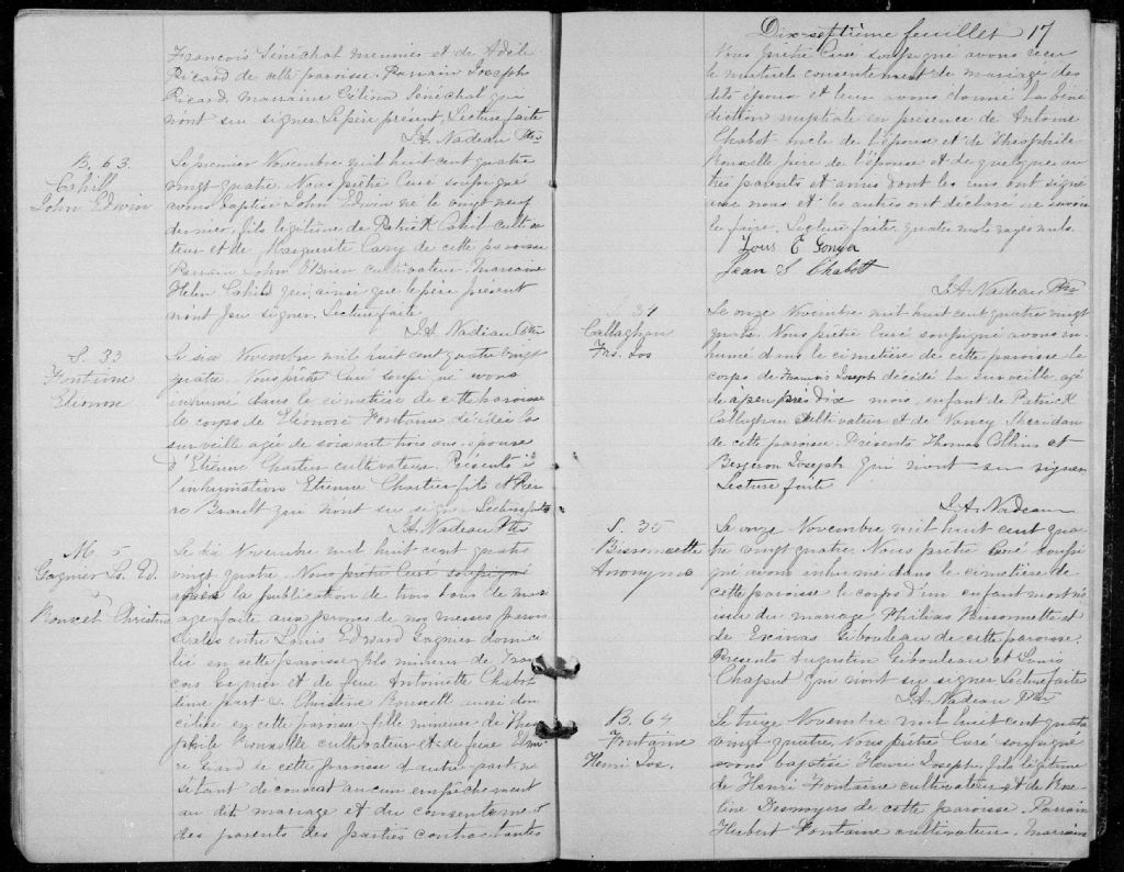 - Cette série regroupe les registres originaux de l'état civil, lesquels contiennent les enregistrements de baptêmes, de mariages et de sépultures consignés par le curé ou son représentant desservant la communauté de confession catholique de la paroisse de Notre-Dame-de-Granby pour la période 1851-1899. On retrouve également, en règle générale, un index nominatif situé à la fin de chaque registre