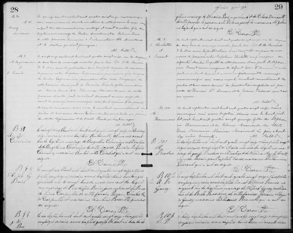 - Cette série regroupe les registres originaux de l'état civil, lesquels contiennent les enregistrements de baptêmes, de mariages et de sépultures consignés par le curé ou son représentant desservant la communauté de confession catholique de la paroisse de Notre-Dame-de-Granby pour la période 1851-1899. On retrouve également, en règle générale, un index nominatif situé à la fin de chaque registre