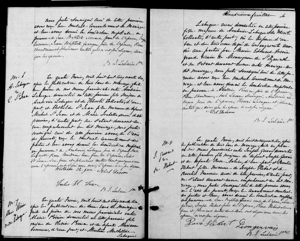 - Cette série regroupe les registres originaux de l'état civil, lesquels contiennent les enregistrements de baptêmes, de mariages et de sépultures consignés par le curé ou son représentant au cours de la période concernée par les documents.Outre les renseignements à caractère généalogique que nous pouvons y puiser, cette série peut constituer une source documentaire importante pour toute étude statistique ou comparative sur les conditions de vie à différentes époques (mortalité infantile, espérance de vie) ou pour toute recherche portant sur l'occupation des terres (lieu de résidence), sur le mode de vie (métiers et professions, statut et âge des époux), sur les classes sociales (titres des parties impliquées, témoins/amis/parents présents lors d'un mariage), sur des évènements spéciaux (quelques mentions dans les sépultures) et sur des sujets à incidence médicale tels les maladies héréditaires (cause du décès)