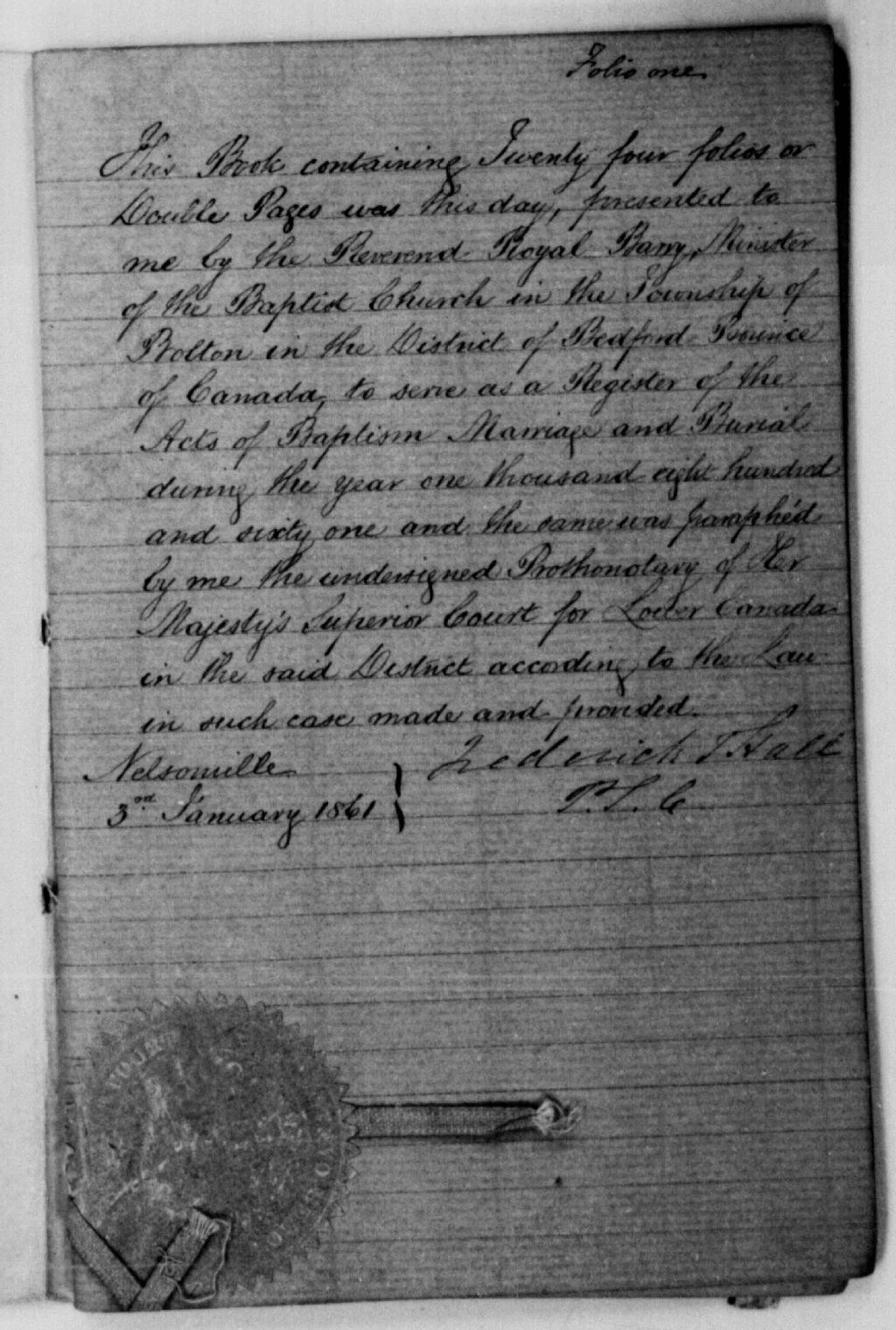 - Cette série regroupe les registres originaux de l'état civil, lesquels contiennent les enregistrements de baptêmes, de mariages et de sépultures consignés par le ministre desservant la communauté de confession baptiste de Bolton-Est dans le canton de Bolton pour la période 1861-1869. On retrouve également, en règle générale, un index nominatif situé à la fin de chaque registre