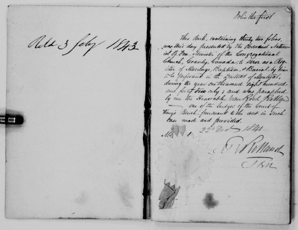 - Cette série regroupe les registres originaux de l'état civil, lesquels contiennent les enregistrements de baptêmes, de mariages et de sépultures consignés par le ministre desservant la communauté de confession congrégationaliste de Granby pour la période 1842-1899. On retrouve également, en règle générale, un index nominatif situé à la fin de chaque registre