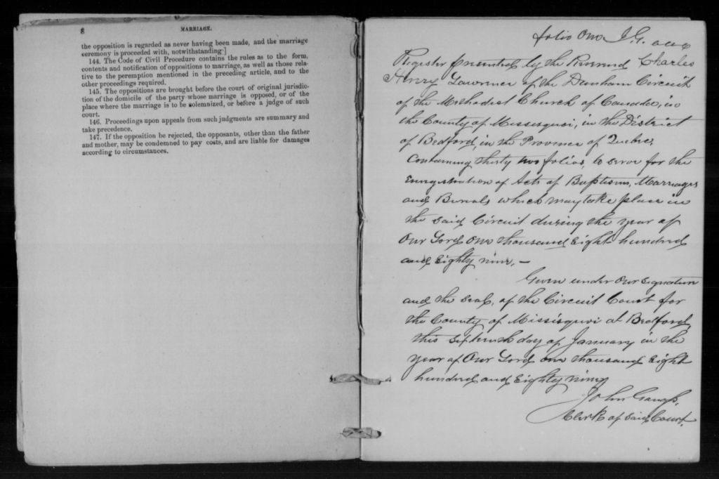 Dunham Circuit Methodist Church, 1820-1899, Archives nationales à Sherbrooke, Fonds Cour supérieure. District judiciaire de Bedford. État civil, (05S,CE502,S77).