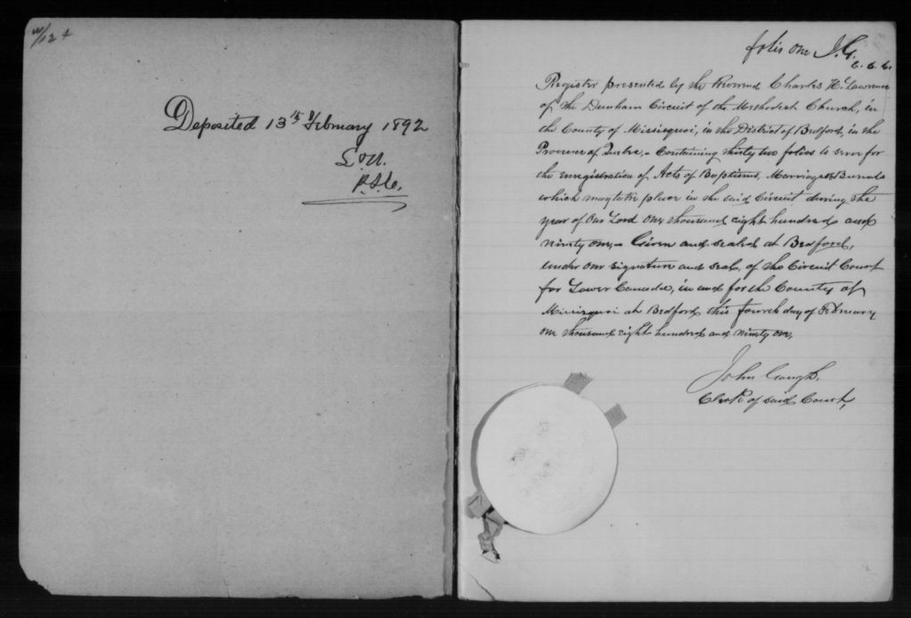 Dunham Circuit Methodist Church, 1820-1899, Archives nationales à Sherbrooke, Fonds Cour supérieure. District judiciaire de Bedford. État civil, (05S,CE502,S77).