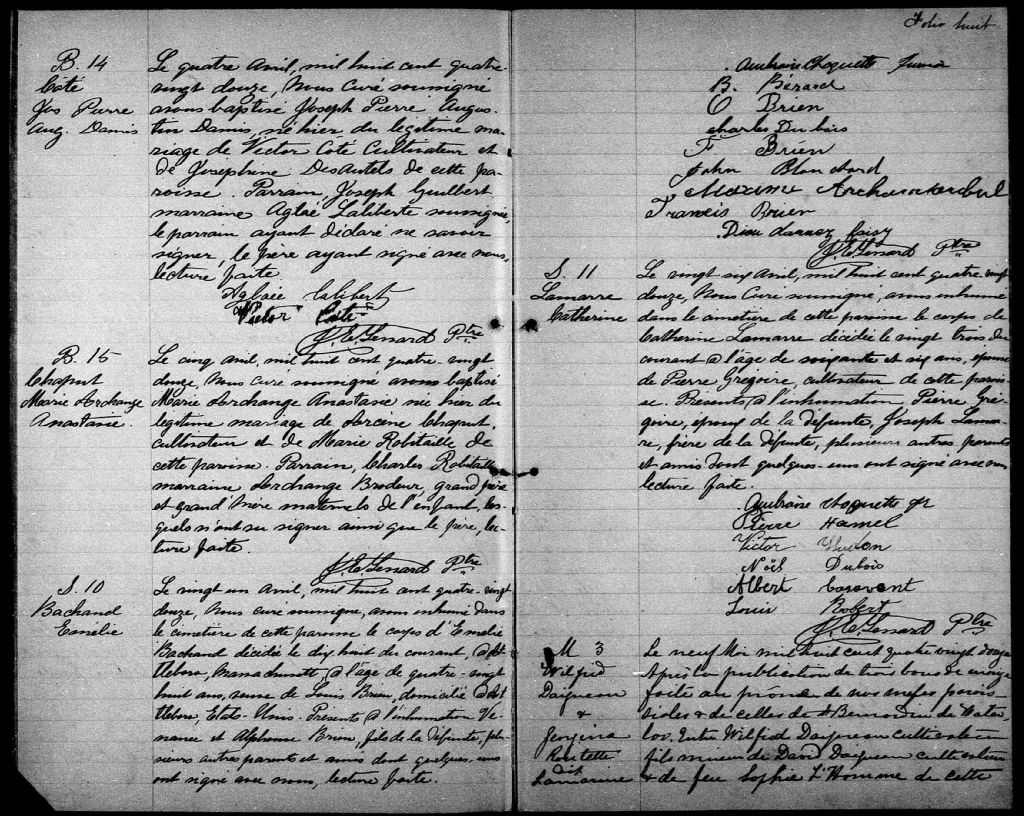 - Cette série regroupe les registres originaux de l'état civil, lesquels contiennent les enregistrements de baptêmes, de mariages et de sépultures consignés par le curé ou son représentant desservant la communauté de confession catholique de la paroisse de Sainte-Anne-de-la-Rochelle pour la période 1857-1899. On retrouve également, en règle générale, un index nominatif situé à la fin de chaque registre