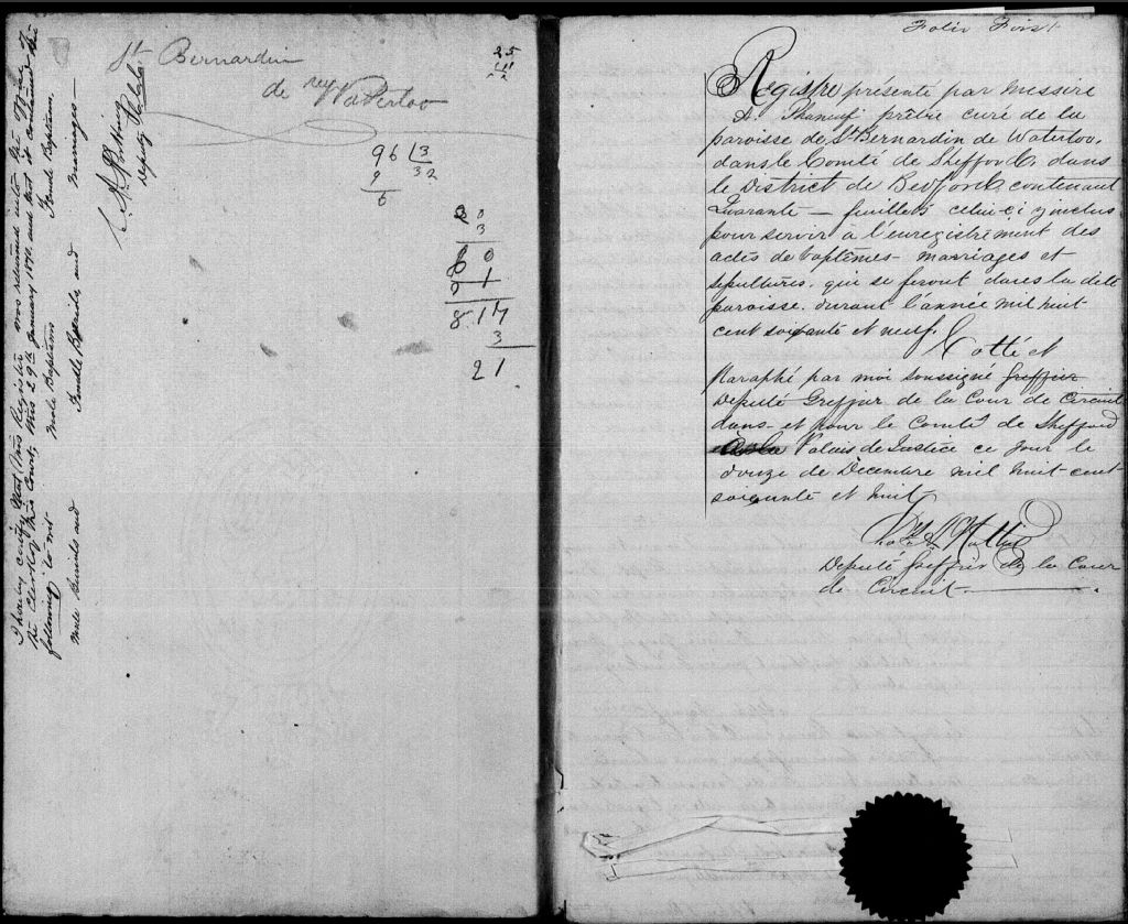 - Cette série regroupe les registres originaux de l'état civil, lesquels contiennent les enregistrements de baptêmes, de mariages et de sépultures consignés par le curé ou son représentant desservant la communauté de confession catholique de la paroisse de Saint-Bernardin-de-Waterloo pour la période 1865-1899. On retrouve également, en règle générale, un index nominatif situé à la fin de chaque registre