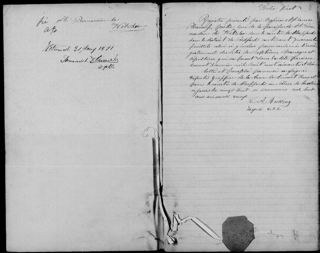 - Cette série regroupe les registres originaux de l'état civil, lesquels contiennent les enregistrements de baptêmes, de mariages et de sépultures consignés par le curé ou son représentant desservant la communauté de confession catholique de la paroisse de Saint-Bernardin-de-Waterloo pour la période 1865-1899. On retrouve également, en règle générale, un index nominatif situé à la fin de chaque registre