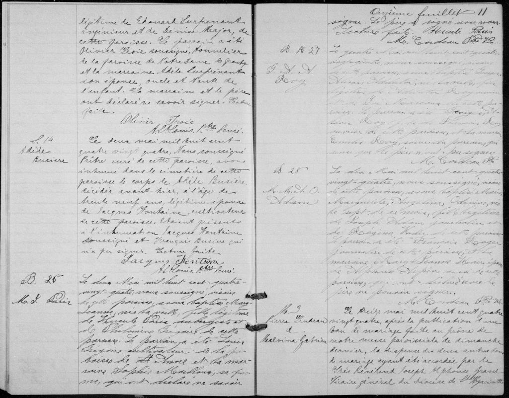 - Cette série regroupe les registres originaux de l'état civil, lesquels contiennent les enregistrements de baptêmes, de mariages et de sépultures consignés par le curé ou son représentant desservant la communauté de confession catholique de la paroisse de Saint-Bernardin-de-Waterloo pour la période 1865-1899. On retrouve également, en règle générale, un index nominatif situé à la fin de chaque registre