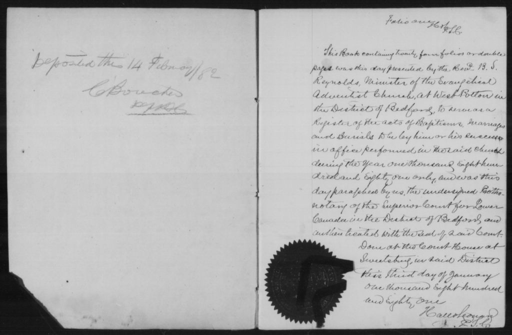 - Cette série regroupe les registres originaux de l'état civil, lesquels contiennent les enregistrements de baptêmes, de mariages et de sépultures consignés par le ministre desservant la communauté de confession adventiste de Dunkin dans le canton de Potton pour la période 1881-1932. On retrouve également, en règle générale, un index nominatif situé à la fin de chaque registre