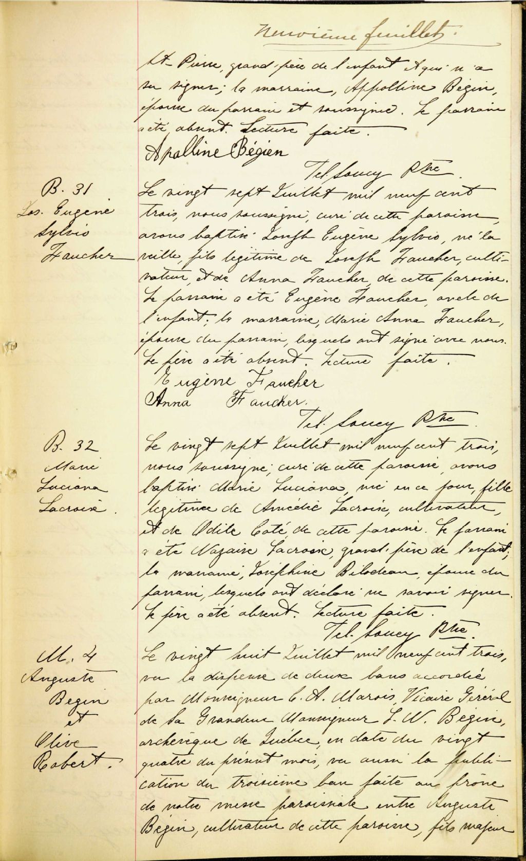 - Cette série regroupe les registres originaux de l'état civil, lesquels contiennent les enregistrements de baptêmes, de mariages et de sépultures consignés par le curé ou son représentant desservant la communauté de confession catholique de la paroisse Saint-Ludger. On retrouve également, en règle générale, un index nominatif à la fin de chaque registre.Le registre de 1918 comprend quelques actes de la paroisse de Saint-Hubert de Spaulding (CE503,S19)Avant 1876, voir Saint-Samuel de Gayhurst (CE503,S13). Pour 1913, voir aussi Saint-Hubert de Spaulding (CE503,S19)