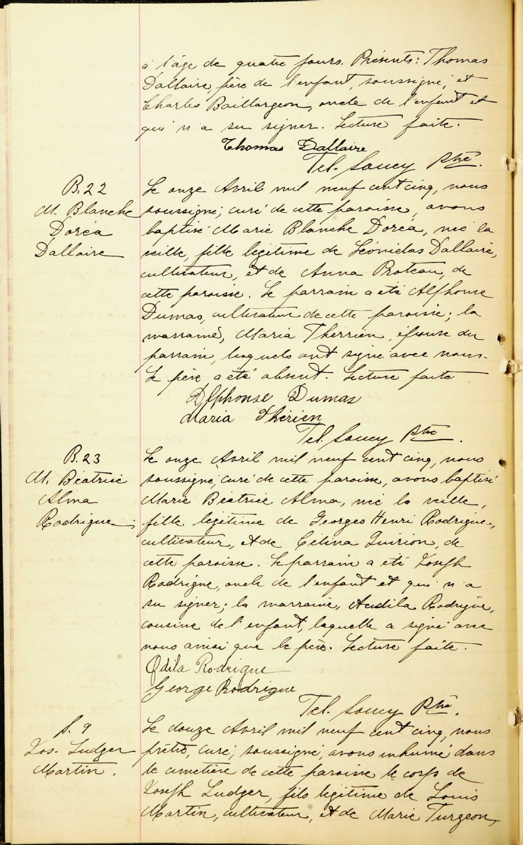 - Cette série regroupe les registres originaux de l'état civil, lesquels contiennent les enregistrements de baptêmes, de mariages et de sépultures consignés par le curé ou son représentant desservant la communauté de confession catholique de la paroisse Saint-Ludger. On retrouve également, en règle générale, un index nominatif à la fin de chaque registre.Le registre de 1918 comprend quelques actes de la paroisse de Saint-Hubert de Spaulding (CE503,S19)Avant 1876, voir Saint-Samuel de Gayhurst (CE503,S13). Pour 1913, voir aussi Saint-Hubert de Spaulding (CE503,S19)