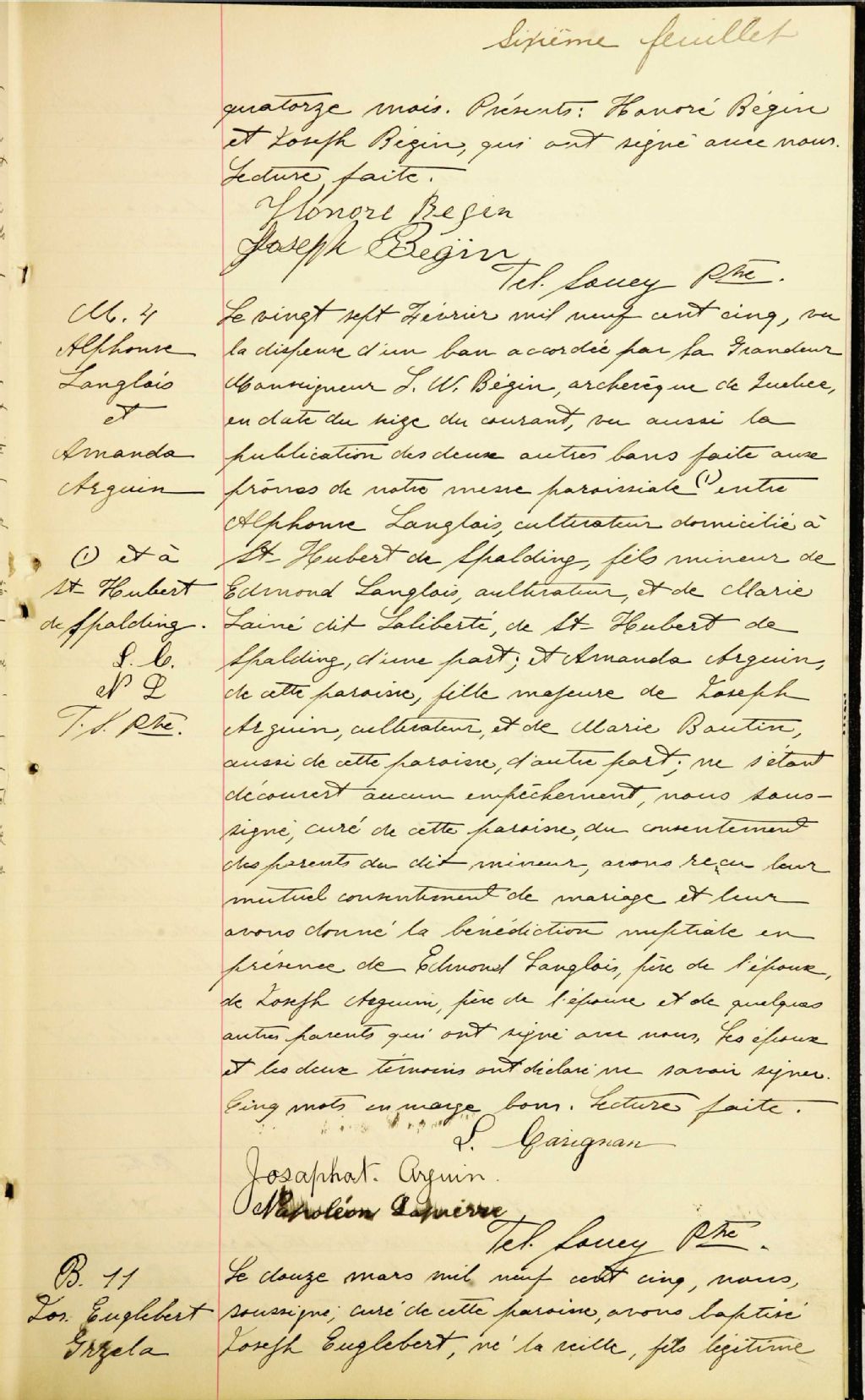- Cette série regroupe les registres originaux de l'état civil, lesquels contiennent les enregistrements de baptêmes, de mariages et de sépultures consignés par le curé ou son représentant desservant la communauté de confession catholique de la paroisse Saint-Ludger. On retrouve également, en règle générale, un index nominatif à la fin de chaque registre.Le registre de 1918 comprend quelques actes de la paroisse de Saint-Hubert de Spaulding (CE503,S19)Avant 1876, voir Saint-Samuel de Gayhurst (CE503,S13). Pour 1913, voir aussi Saint-Hubert de Spaulding (CE503,S19)