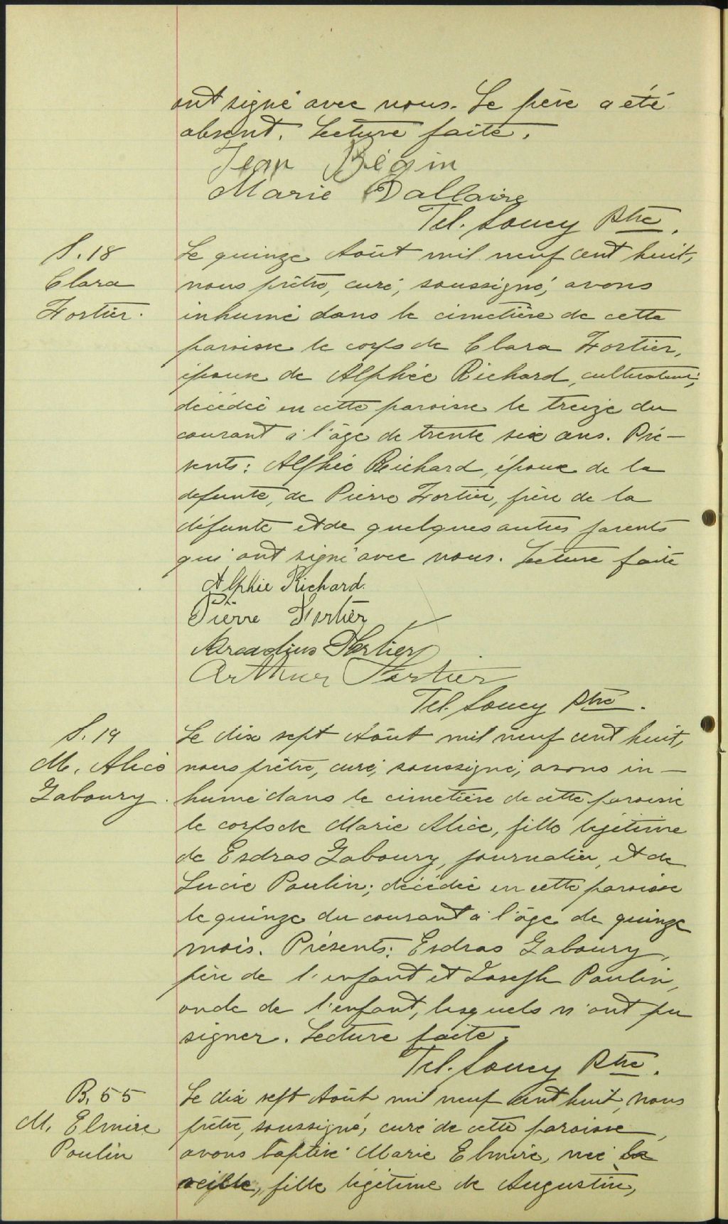 - Cette série regroupe les registres originaux de l'état civil, lesquels contiennent les enregistrements de baptêmes, de mariages et de sépultures consignés par le curé ou son représentant desservant la communauté de confession catholique de la paroisse Saint-Ludger. On retrouve également, en règle générale, un index nominatif à la fin de chaque registre.Le registre de 1918 comprend quelques actes de la paroisse de Saint-Hubert de Spaulding (CE503,S19)Avant 1876, voir Saint-Samuel de Gayhurst (CE503,S13). Pour 1913, voir aussi Saint-Hubert de Spaulding (CE503,S19)