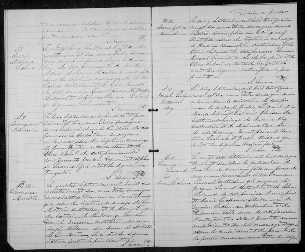 - Cette série regroupe les registres originaux de l'état civil, lesquels contiennent les enregistrements de baptêmes, de mariages et de sépultures consignés par le curé ou son représentant desservant la communauté de confession catholique de la paroisse Saint-Samuel à Lac-Drolet. On retrouve également, en règle générale, un index nominatif à la fin de chaque registre.Le registre de 1917 comprend quelques actes de Saint-Hubert de Spaulding (CE503,S19); celui de 1918 en comprend de Sainte-Cécile (CE503,S18)Avant 1884, voir Saint-Sébastien (CE503,S14); pour 1913, voir aussi Saint-Hubert de Spaulding (CE503,S19)