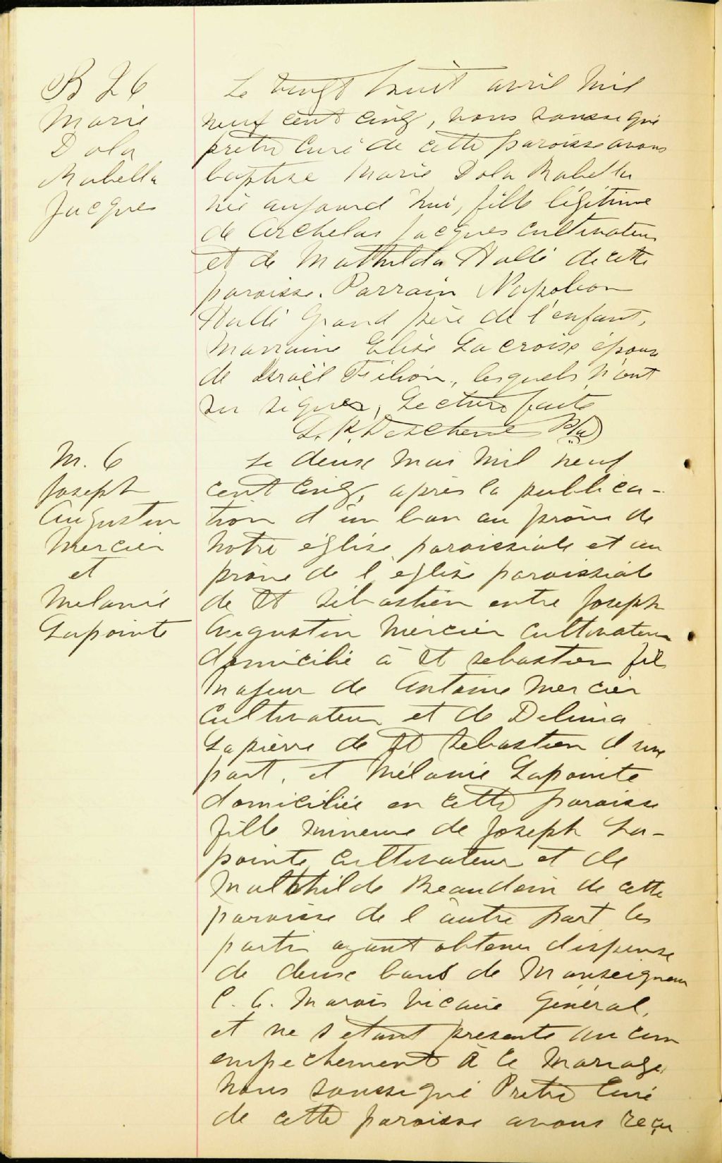 - Cette série regroupe les registres originaux de l'état civil, lesquels contiennent les enregistrements de baptêmes, de mariages et de sépultures consignés par le curé ou son représentant desservant la communauté de confession catholique de la paroisse Saint-Samuel à Lac-Drolet. On retrouve également, en règle générale, un index nominatif à la fin de chaque registre.Le registre de 1917 comprend quelques actes de Saint-Hubert de Spaulding (CE503,S19); celui de 1918 en comprend de Sainte-Cécile (CE503,S18)Avant 1884, voir Saint-Sébastien (CE503,S14); pour 1913, voir aussi Saint-Hubert de Spaulding (CE503,S19)