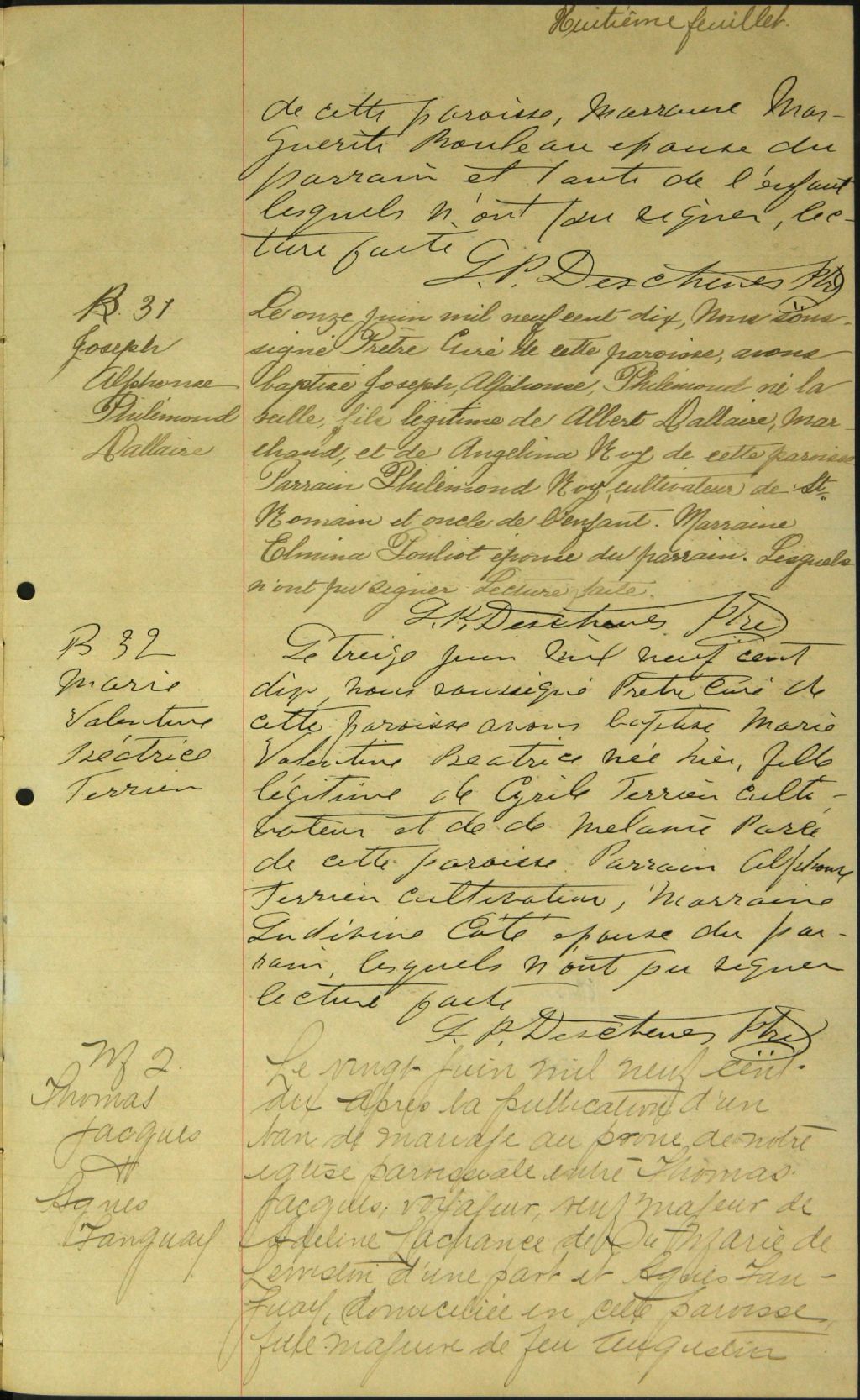- Cette série regroupe les registres originaux de l'état civil, lesquels contiennent les enregistrements de baptêmes, de mariages et de sépultures consignés par le curé ou son représentant desservant la communauté de confession catholique de la paroisse Saint-Samuel à Lac-Drolet. On retrouve également, en règle générale, un index nominatif à la fin de chaque registre.Le registre de 1917 comprend quelques actes de Saint-Hubert de Spaulding (CE503,S19); celui de 1918 en comprend de Sainte-Cécile (CE503,S18)Avant 1884, voir Saint-Sébastien (CE503,S14); pour 1913, voir aussi Saint-Hubert de Spaulding (CE503,S19)