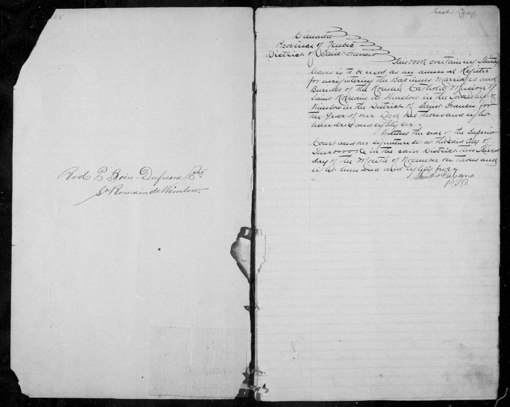 Cette série regroupe les registres originaux de l'état civil, lesquels contiennent les enregistrements de baptêmes, de mariages et de sépultures consignés par le curé ou son représentant desservant la communauté de confession catholique de la paroisse Saint-Romain. On retrouve également, en règle générale, un index nominatif à la fin de chaque registre.Les registres de 1875 à 1888 contiennent les entrées de Sainte-Cécile (CE503,S18).Pour 1864 à 1867, voir Saint-Gabriel de Stratford (CE503,S9)
