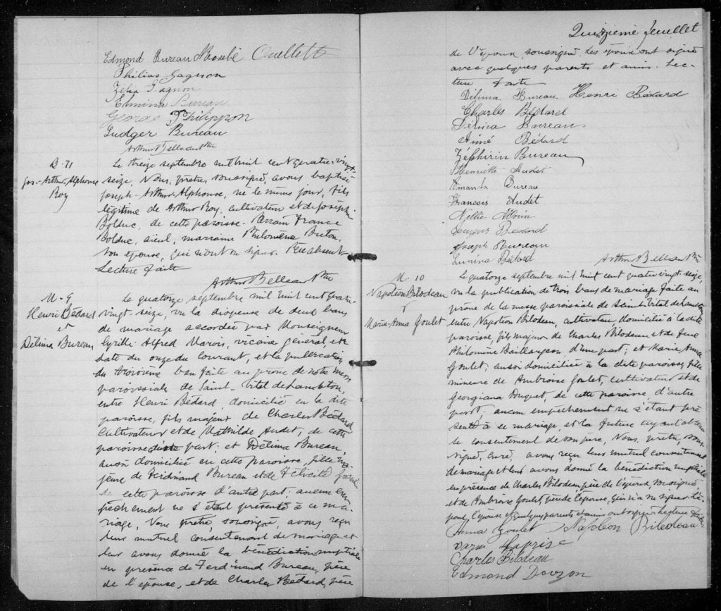 - Cette série regroupe les registres originaux de l'état civil, lesquels contiennent les enregistrements de baptêmes, de mariages et de sépultures consignés par le curé ou son représentant desservant la communauté de confession catholique de la paroisse Saint-Vital de Lambton. On retrouve également, en règle générale, un index nominatif à la fin de chaque registre.Avant 1881, voir Saint-Vital de Lambton (CE305,S25) conservé au Centre d'archives de Québec. Quelques entrées sont enregistrées dans les registres de 1877 à 1881 de la paroisse Saint-Romain (CE503,S12).