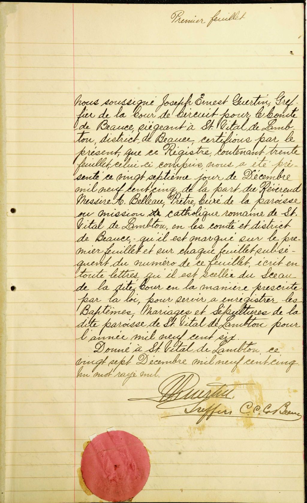 - Cette série regroupe les registres originaux de l'état civil, lesquels contiennent les enregistrements de baptêmes, de mariages et de sépultures consignés par le curé ou son représentant desservant la communauté de confession catholique de la paroisse Saint-Vital de Lambton. On retrouve également, en règle générale, un index nominatif à la fin de chaque registre.Avant 1881, voir Saint-Vital de Lambton (CE305,S25) conservé au Centre d'archives de Québec. Quelques entrées sont enregistrées dans les registres de 1877 à 1881 de la paroisse Saint-Romain (CE503,S12).