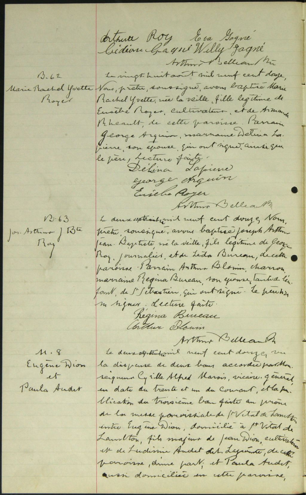 - Cette série regroupe les registres originaux de l'état civil, lesquels contiennent les enregistrements de baptêmes, de mariages et de sépultures consignés par le curé ou son représentant desservant la communauté de confession catholique de la paroisse Saint-Vital de Lambton. On retrouve également, en règle générale, un index nominatif à la fin de chaque registre.Avant 1881, voir Saint-Vital de Lambton (CE305,S25) conservé au Centre d'archives de Québec. Quelques entrées sont enregistrées dans les registres de 1877 à 1881 de la paroisse Saint-Romain (CE503,S12).