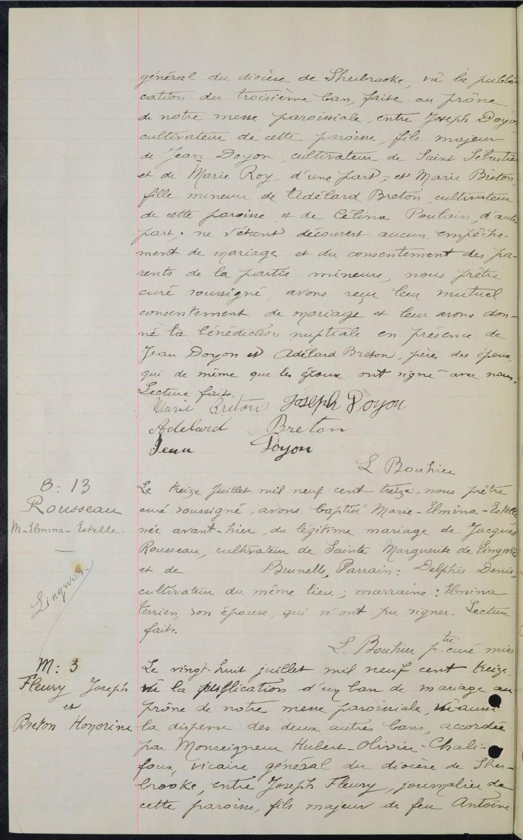 - Cette série regroupe les registres originaux de l'état civil, lesquels contiennent les enregistrements de baptêmes, de mariages et de sépultures consignés par le curé ou son représentant desservant la communauté de confession catholique de la paroisse Saint-Alphonse de Stornoway. On retrouve également, en règle générale, un index nominatif à la fin de chaque registre.Pour 1908, voir Saint-Gabriel de Stratford (CE503,S9).Les registres de 1909 à 1913 comprennent aussi les entrées de Sainte-Marguerite de Lingwick.Les registres de 1917 et de 1921 contiennent des entrées pour la mission de Milan, qui deviendra la paroisse Saint-Ambroise de Milan et pour la mission Notre-Dame-du-Bon-Conseil de Springhill (aujourd'hui Nantes).