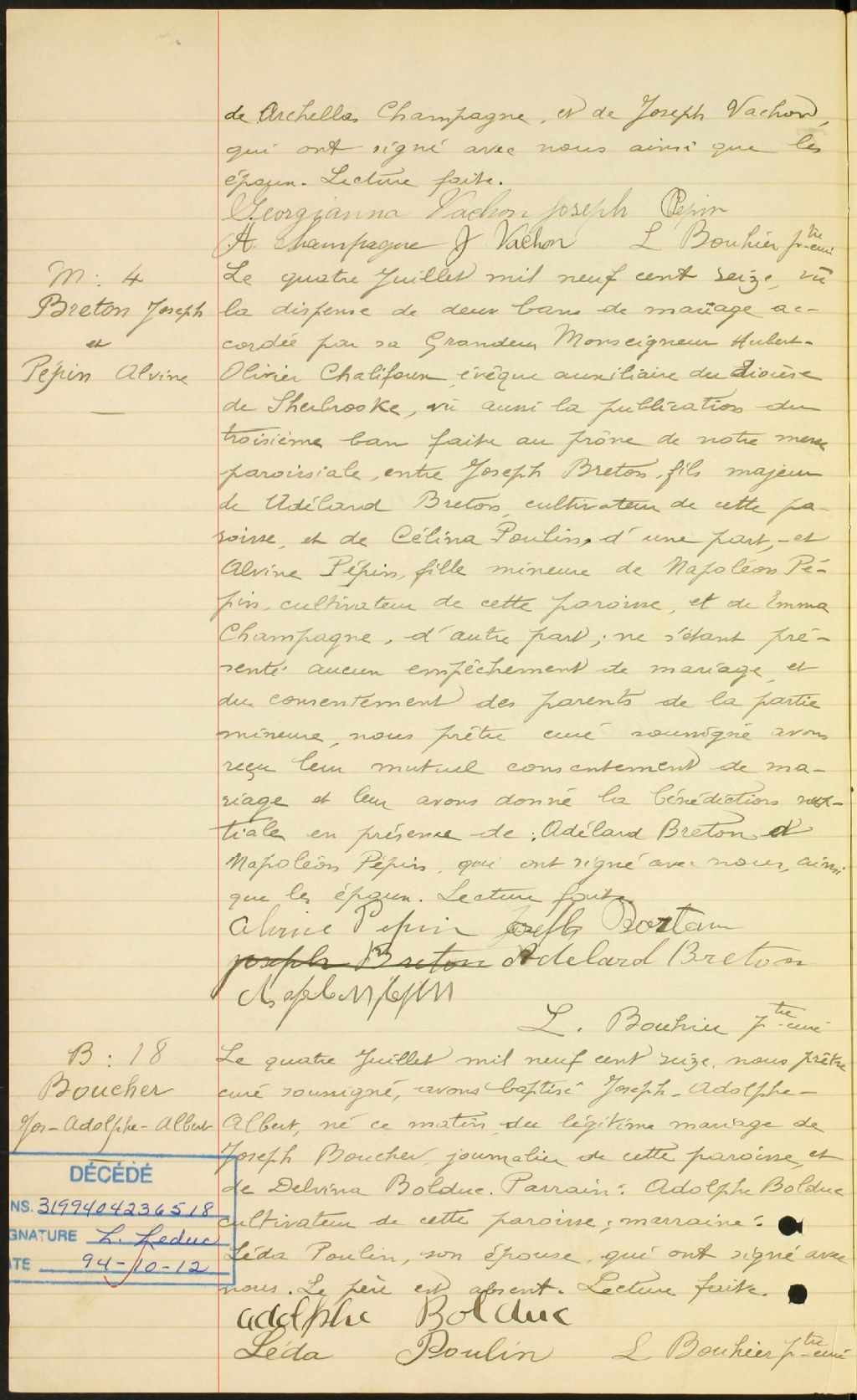 - Cette série regroupe les registres originaux de l'état civil, lesquels contiennent les enregistrements de baptêmes, de mariages et de sépultures consignés par le curé ou son représentant desservant la communauté de confession catholique de la paroisse Saint-Alphonse de Stornoway. On retrouve également, en règle générale, un index nominatif à la fin de chaque registre.Pour 1908, voir Saint-Gabriel de Stratford (CE503,S9).Les registres de 1909 à 1913 comprennent aussi les entrées de Sainte-Marguerite de Lingwick.Les registres de 1917 et de 1921 contiennent des entrées pour la mission de Milan, qui deviendra la paroisse Saint-Ambroise de Milan et pour la mission Notre-Dame-du-Bon-Conseil de Springhill (aujourd'hui Nantes).
