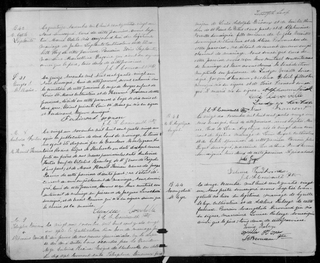 - Cette série regroupe les registres originaux de l'état civil, lesquels contiennent les enregistrements de baptêmes, de mariages et de sépultures consignés par le curé ou son représentant desservant la communauté de confession catholique de la paroisse Notre-Dame-des-Bois. On retrouve également, en règle générale, un index nominatif à la fin de chaque registre.Pour les années 1876 à 1878, voir Saint-Pierre de La Patrie (CE501,S22).