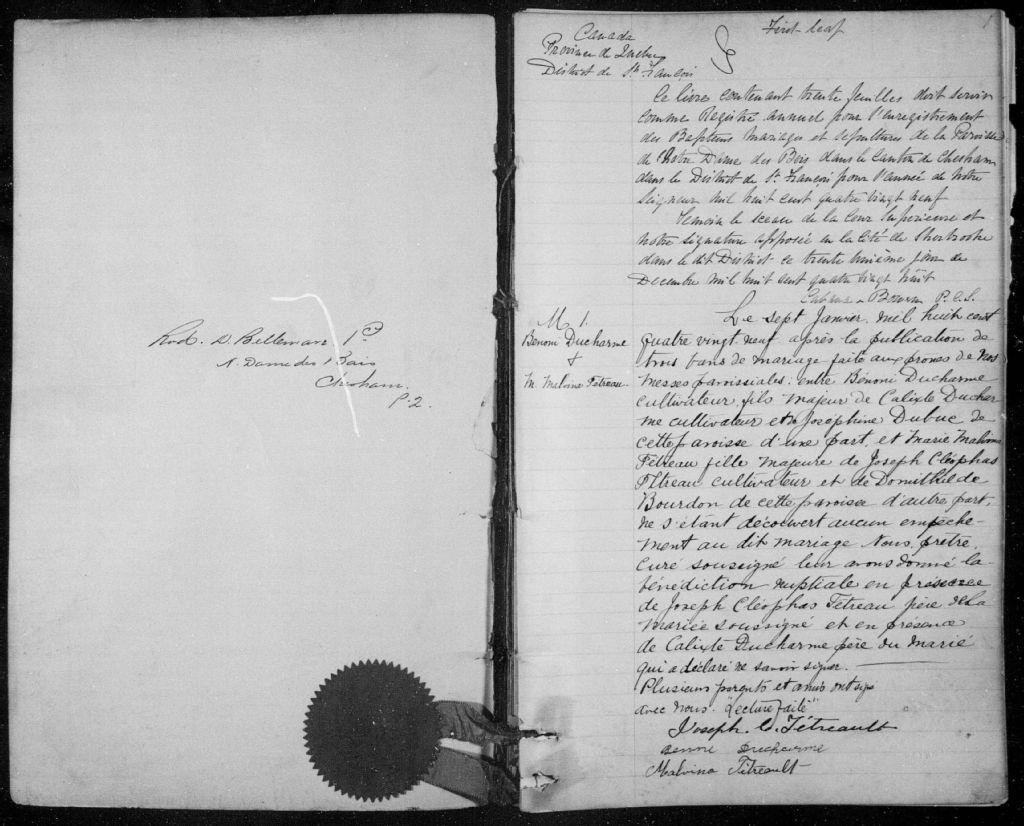 Cette série regroupe les registres originaux de l'état civil, lesquels contiennent les enregistrements de baptêmes, de mariages et de sépultures consignés par le curé ou son représentant desservant la communauté de confession catholique de la paroisse Notre-Dame-des-Bois. On retrouve également, en règle générale, un index nominatif à la fin de chaque registre.Pour les années 1876 à 1878, voir Saint-Pierre de La Patrie (CE501,S22).