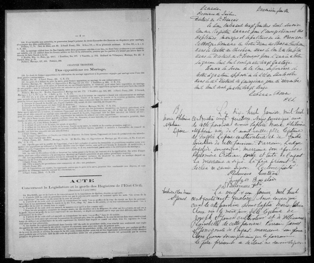 - Cette série regroupe les registres originaux de l'état civil, lesquels contiennent les enregistrements de baptêmes, de mariages et de sépultures consignés par le curé ou son représentant desservant la communauté de confession catholique de la paroisse Notre-Dame-des-Bois. On retrouve également, en règle générale, un index nominatif à la fin de chaque registre.Pour les années 1876 à 1878, voir Saint-Pierre de La Patrie (CE501,S22).