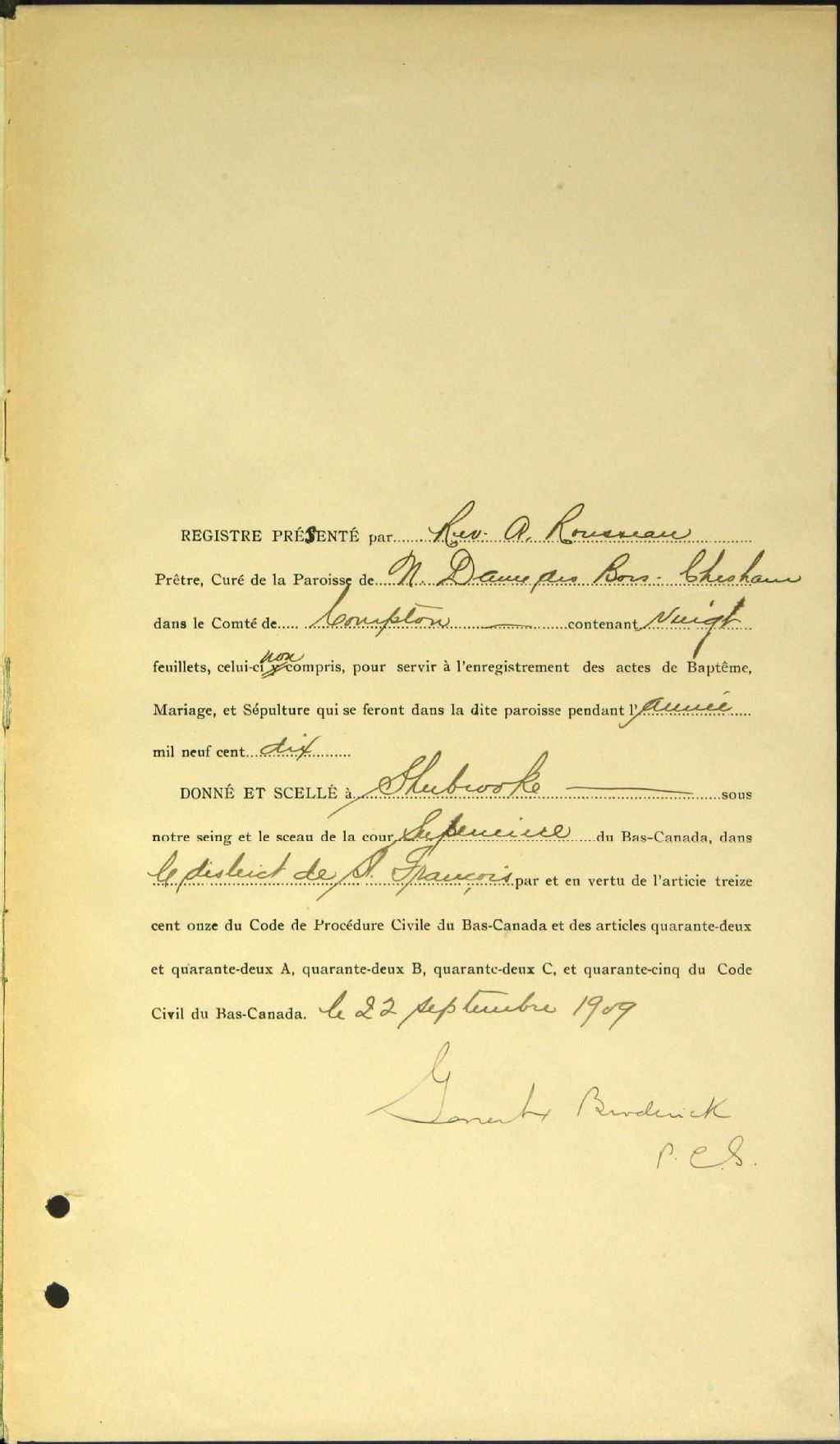 - Cette série regroupe les registres originaux de l'état civil, lesquels contiennent les enregistrements de baptêmes, de mariages et de sépultures consignés par le curé ou son représentant desservant la communauté de confession catholique de la paroisse Notre-Dame-des-Bois. On retrouve également, en règle générale, un index nominatif à la fin de chaque registre.Pour les années 1876 à 1878, voir Saint-Pierre de La Patrie (CE501,S22).