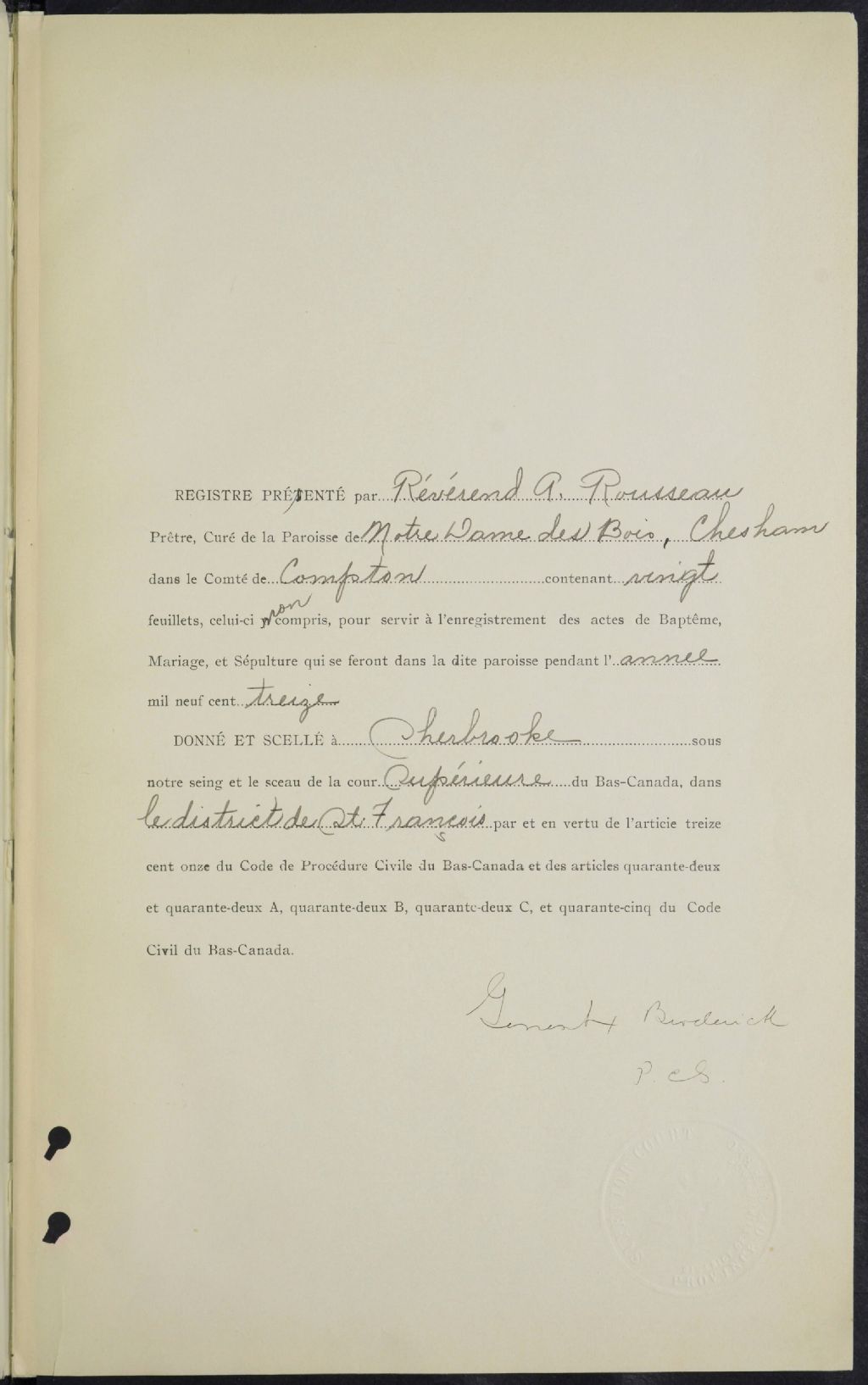 - Cette série regroupe les registres originaux de l'état civil, lesquels contiennent les enregistrements de baptêmes, de mariages et de sépultures consignés par le curé ou son représentant desservant la communauté de confession catholique de la paroisse Notre-Dame-des-Bois. On retrouve également, en règle générale, un index nominatif à la fin de chaque registre.Pour les années 1876 à 1878, voir Saint-Pierre de La Patrie (CE501,S22).
