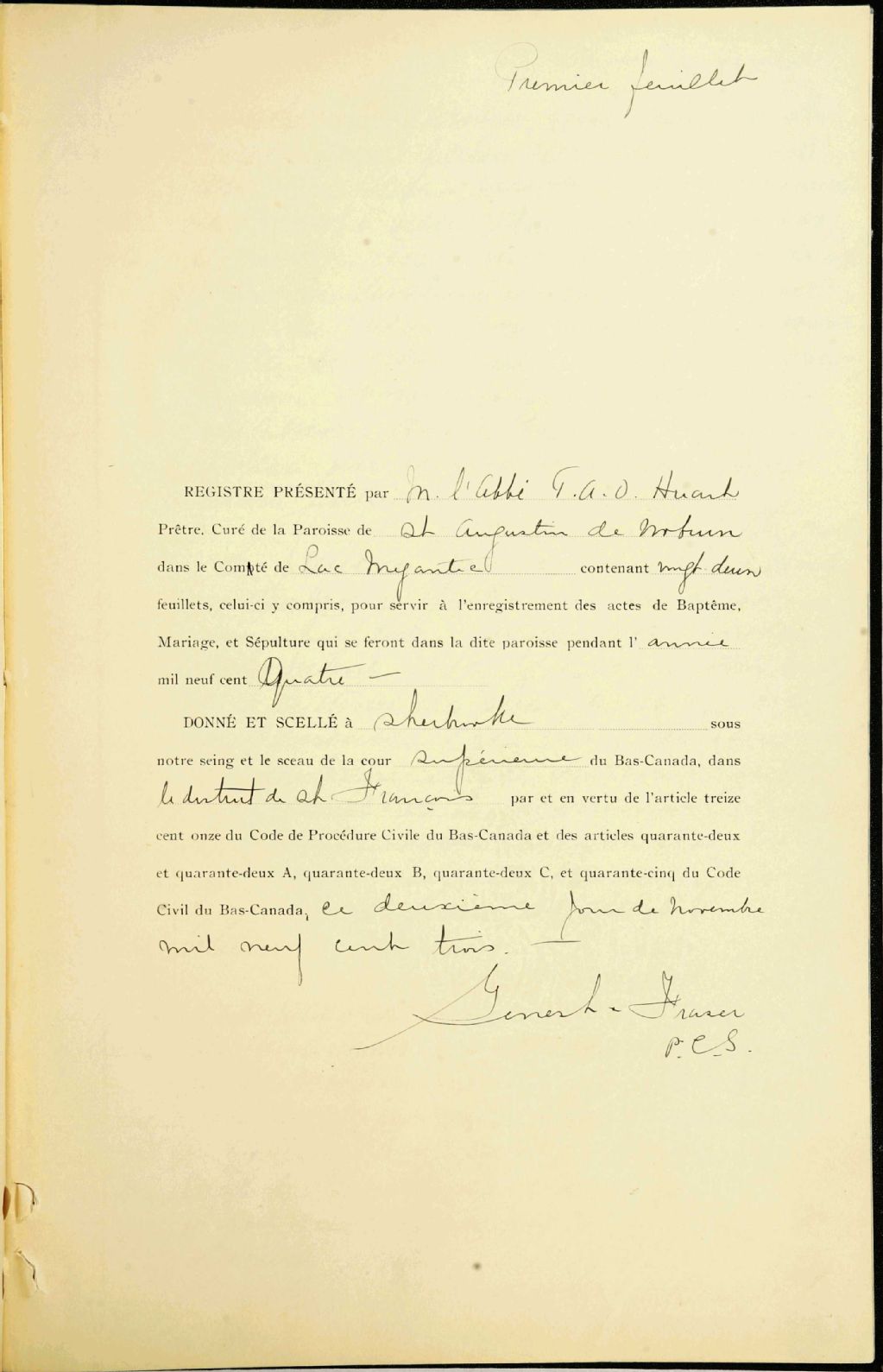 - Cette série regroupe les registres de l'état civil, originaux pour la plupart, lesquels contiennent les enregistrements de baptêmes, de mariages et de sépultures consignés par le curé ou son représentant desservant la communauté de confession catholique de la paroisse Saint-Augustin de Saint-Augustin-de-Woburn. On retrouve également, en règle générale, un index nominatif à la fin de chaque registre.Le registre de 1898 comprend aussi les entrées pour la paroisse Saint-Joseph de Beauce (CE306,S19).Les registres de 1916 et de 1917 comprennent quelques entrées pour la mission de Louise, située dans le canton du même nom; le territoire de cette mission occupé par des chantiers de bûcherons chevauche la région de Woburn et le nord du Maine.Le registre de 1921 contient un acte de la mission de Saint-Hyacinthe de Ditchfield.
