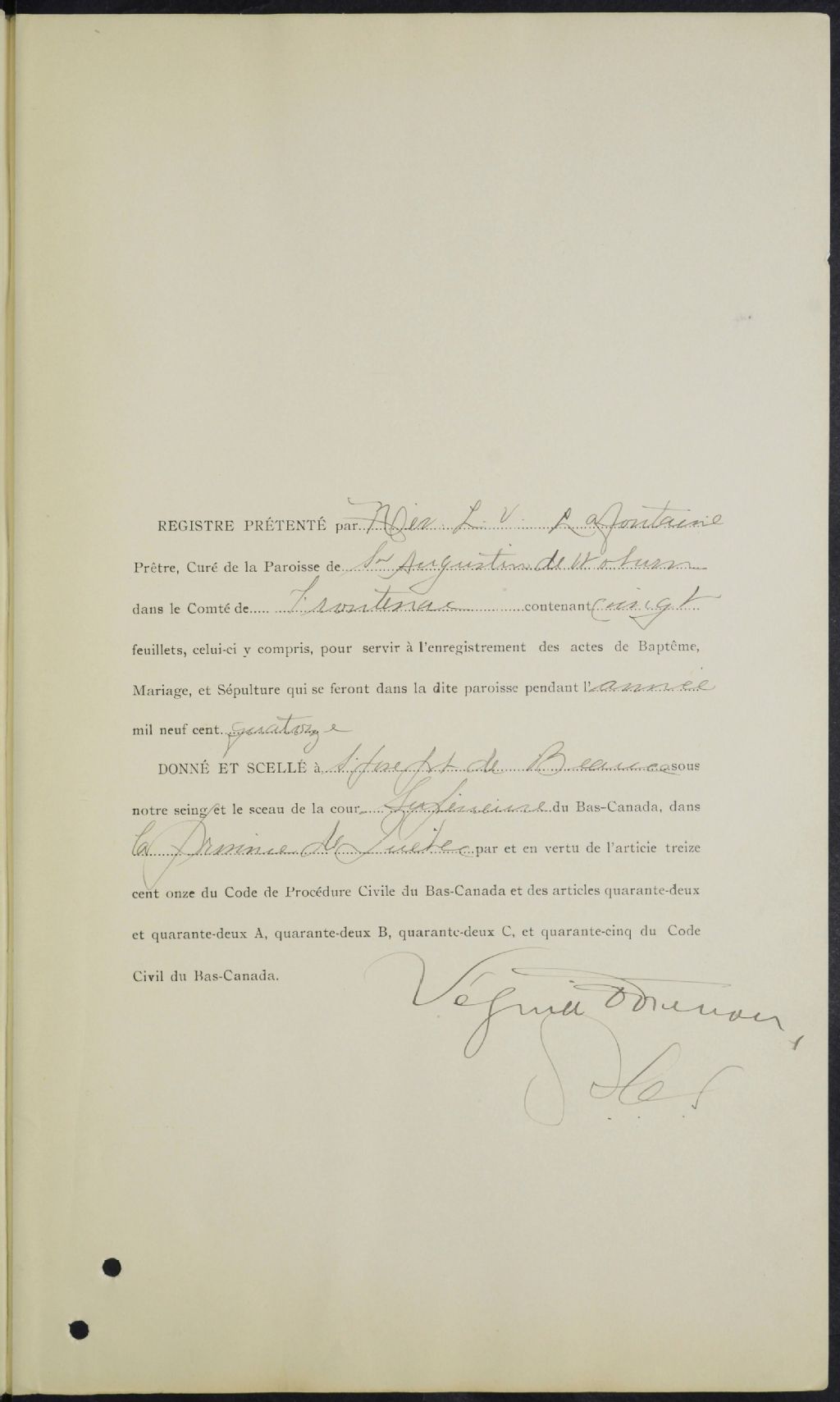 - Cette série regroupe les registres de l'état civil, originaux pour la plupart, lesquels contiennent les enregistrements de baptêmes, de mariages et de sépultures consignés par le curé ou son représentant desservant la communauté de confession catholique de la paroisse Saint-Augustin de Saint-Augustin-de-Woburn. On retrouve également, en règle générale, un index nominatif à la fin de chaque registre.Le registre de 1898 comprend aussi les entrées pour la paroisse Saint-Joseph de Beauce (CE306,S19).Les registres de 1916 et de 1917 comprennent quelques entrées pour la mission de Louise, située dans le canton du même nom; le territoire de cette mission occupé par des chantiers de bûcherons chevauche la région de Woburn et le nord du Maine.Le registre de 1921 contient un acte de la mission de Saint-Hyacinthe de Ditchfield.