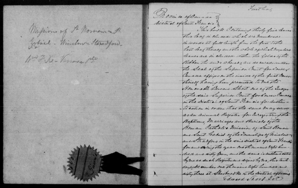 Cette série regroupe les registres originaux de l'état civil, lesquels contiennent les enregistrements de baptêmes, de mariages et de sépultures consignés par le curé ou son représentant desservant la communauté de confession catholique de la paroisse Saint-Gabriel de Stratford. On retrouve également, en règle générale, un index nominatif à la fin de chaque registre.Les registres de 1864 à 1866 incluent les entrées pour Saint-Romain (CE503,S12). Le registre de 1908 inclut les entrées pour la paroisse Saint-Alphonse de Stornoway (CE503,S23)