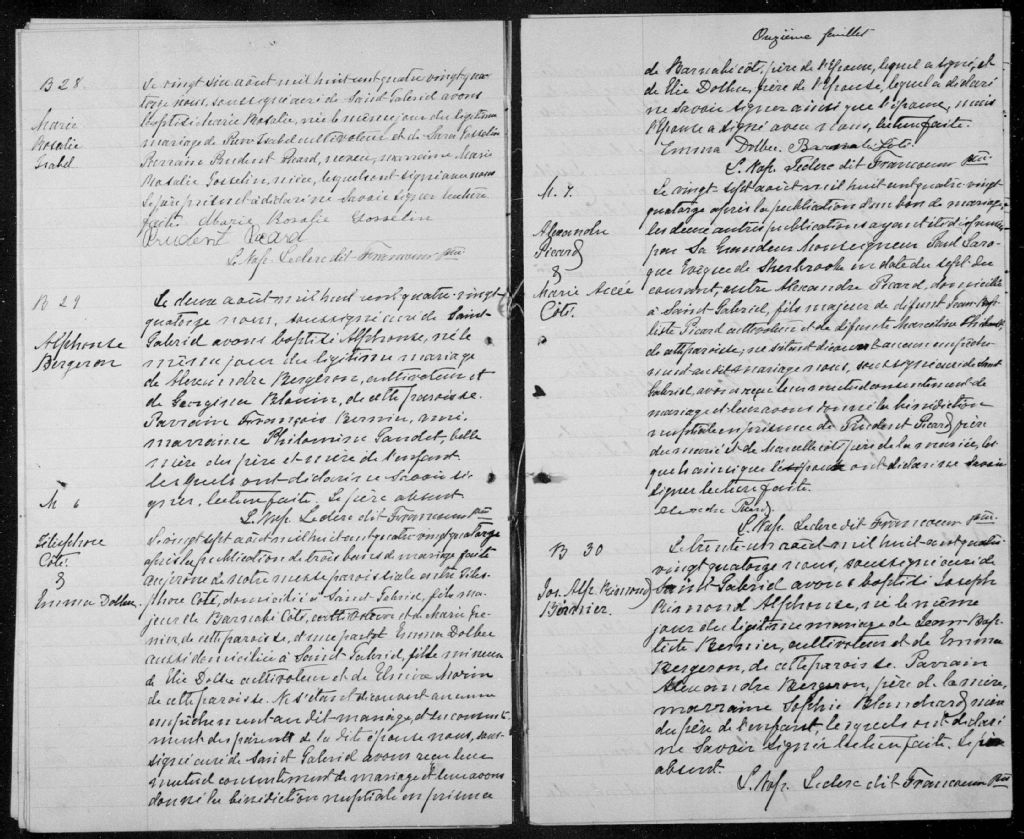 - Cette série regroupe les registres originaux de l'état civil, lesquels contiennent les enregistrements de baptêmes, de mariages et de sépultures consignés par le curé ou son représentant desservant la communauté de confession catholique de la paroisse Saint-Gabriel de Stratford. On retrouve également, en règle générale, un index nominatif à la fin de chaque registre.Les registres de 1864 à 1866 incluent les entrées pour Saint-Romain (CE503,S12). Le registre de 1908 inclut les entrées pour la paroisse Saint-Alphonse de Stornoway (CE503,S23)