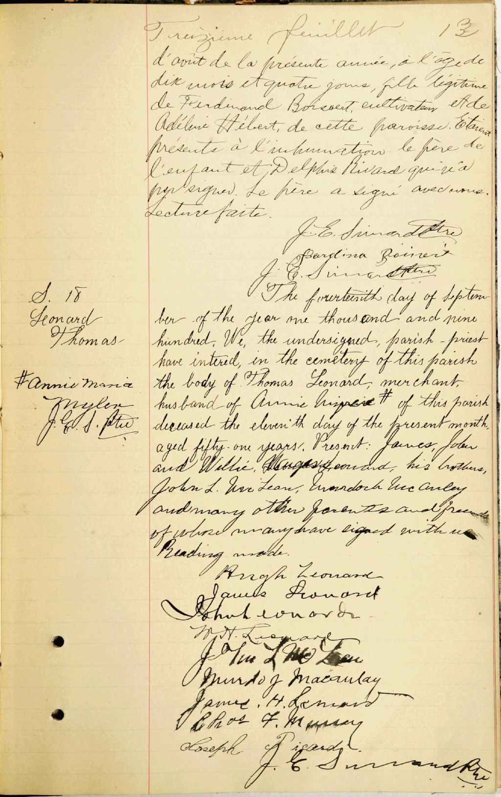 - Cette série regroupe les registres originaux de l'état civil, lesquels contiennent les enregistrements de baptêmes, de mariages et de sépultures consignés par le curé ou son représentant desservant la communauté de confession catholique de la paroisse Saint-Gabriel de Stratford. On retrouve également, en règle générale, un index nominatif à la fin de chaque registre.Les registres de 1864 à 1866 incluent les entrées pour Saint-Romain (CE503,S12). Le registre de 1908 inclut les entrées pour la paroisse Saint-Alphonse de Stornoway (CE503,S23)