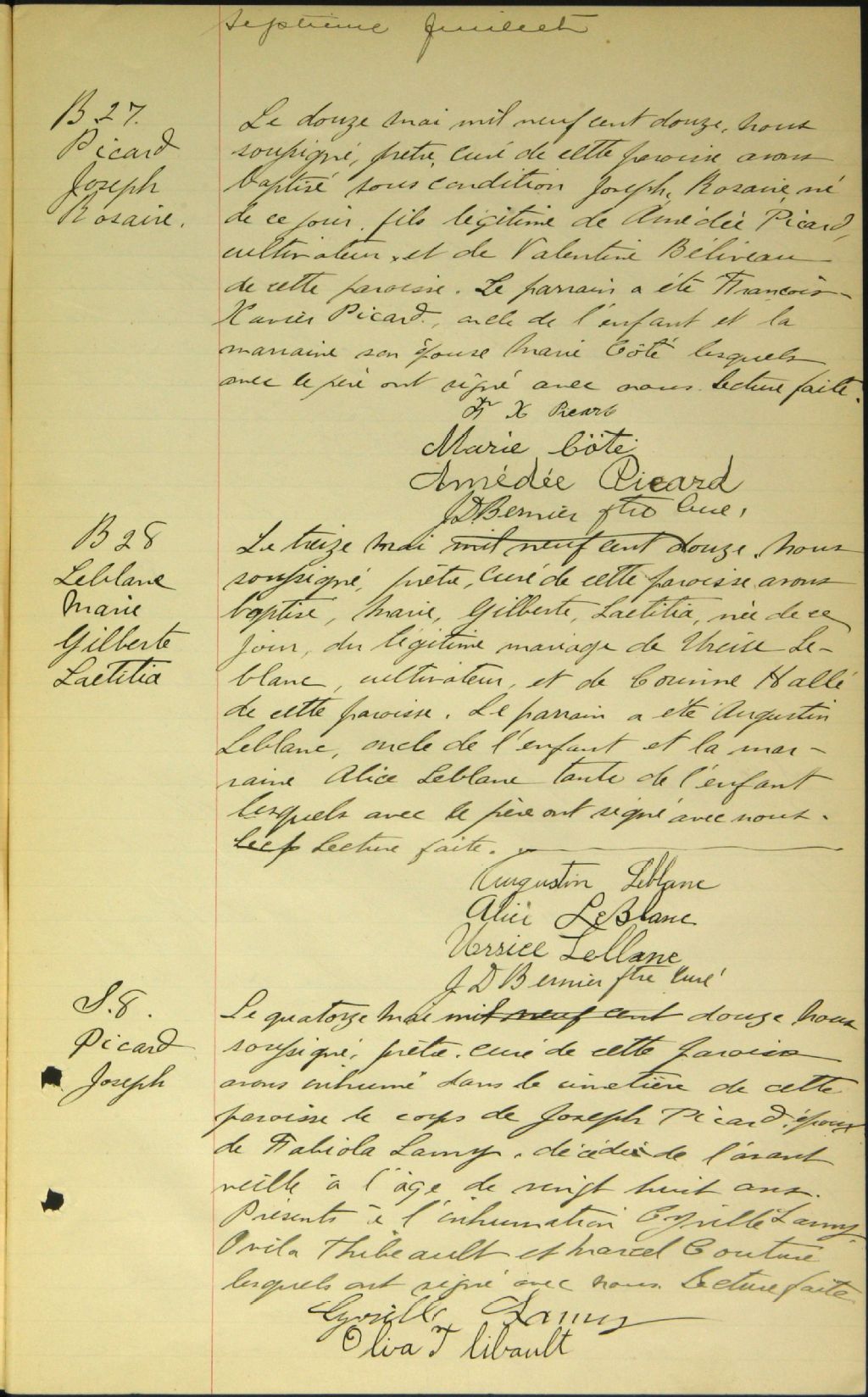 - Cette série regroupe les registres originaux de l'état civil, lesquels contiennent les enregistrements de baptêmes, de mariages et de sépultures consignés par le curé ou son représentant desservant la communauté de confession catholique de la paroisse Saint-Gabriel de Stratford. On retrouve également, en règle générale, un index nominatif à la fin de chaque registre.Les registres de 1864 à 1866 incluent les entrées pour Saint-Romain (CE503,S12). Le registre de 1908 inclut les entrées pour la paroisse Saint-Alphonse de Stornoway (CE503,S23)