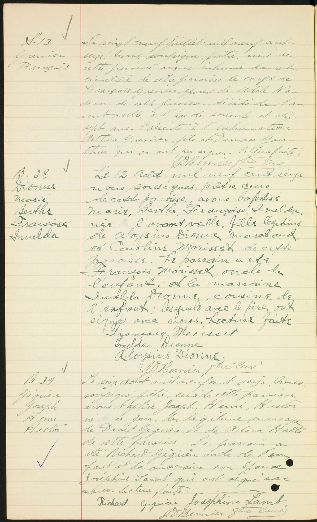 - Cette série regroupe les registres originaux de l'état civil, lesquels contiennent les enregistrements de baptêmes, de mariages et de sépultures consignés par le curé ou son représentant desservant la communauté de confession catholique de la paroisse Saint-Gabriel de Stratford. On retrouve également, en règle générale, un index nominatif à la fin de chaque registre.Les registres de 1864 à 1866 incluent les entrées pour Saint-Romain (CE503,S12). Le registre de 1908 inclut les entrées pour la paroisse Saint-Alphonse de Stornoway (CE503,S23)