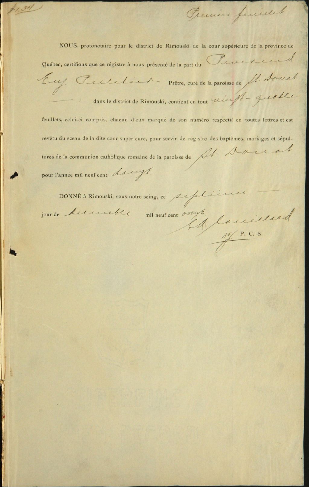 Saint-Donat, 1869-1921, Archives nationales à Rimouski, Fonds Cour supérieure. District judiciaire de Rimouski. État civil, (01R,CE101,S3).