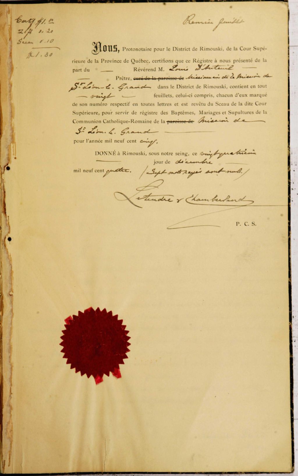 Saint-Léon-le-Grand, 1905-1921, Archives nationales à Rimouski, Fonds Cour supérieure. District judiciaire de Rimouski. État civil, (01R,CE101,S36).